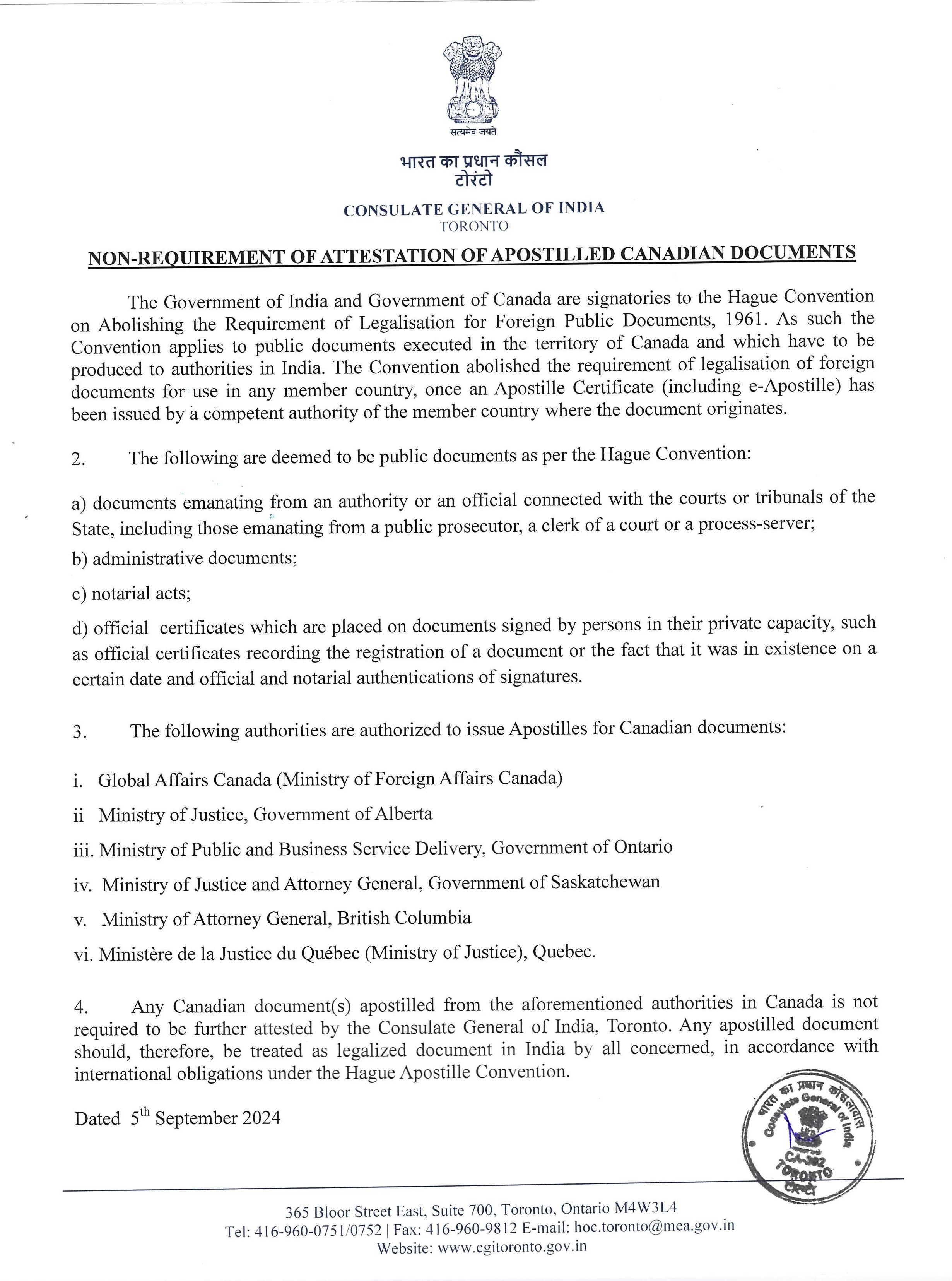 Any Apostille Certificate (including e-Apostille) issued by a competent authority in Canada requires no further attestation/legalization by Consulate General of India, Toronto/ Consulate General of India, Vancouver/HCI-Ottawa